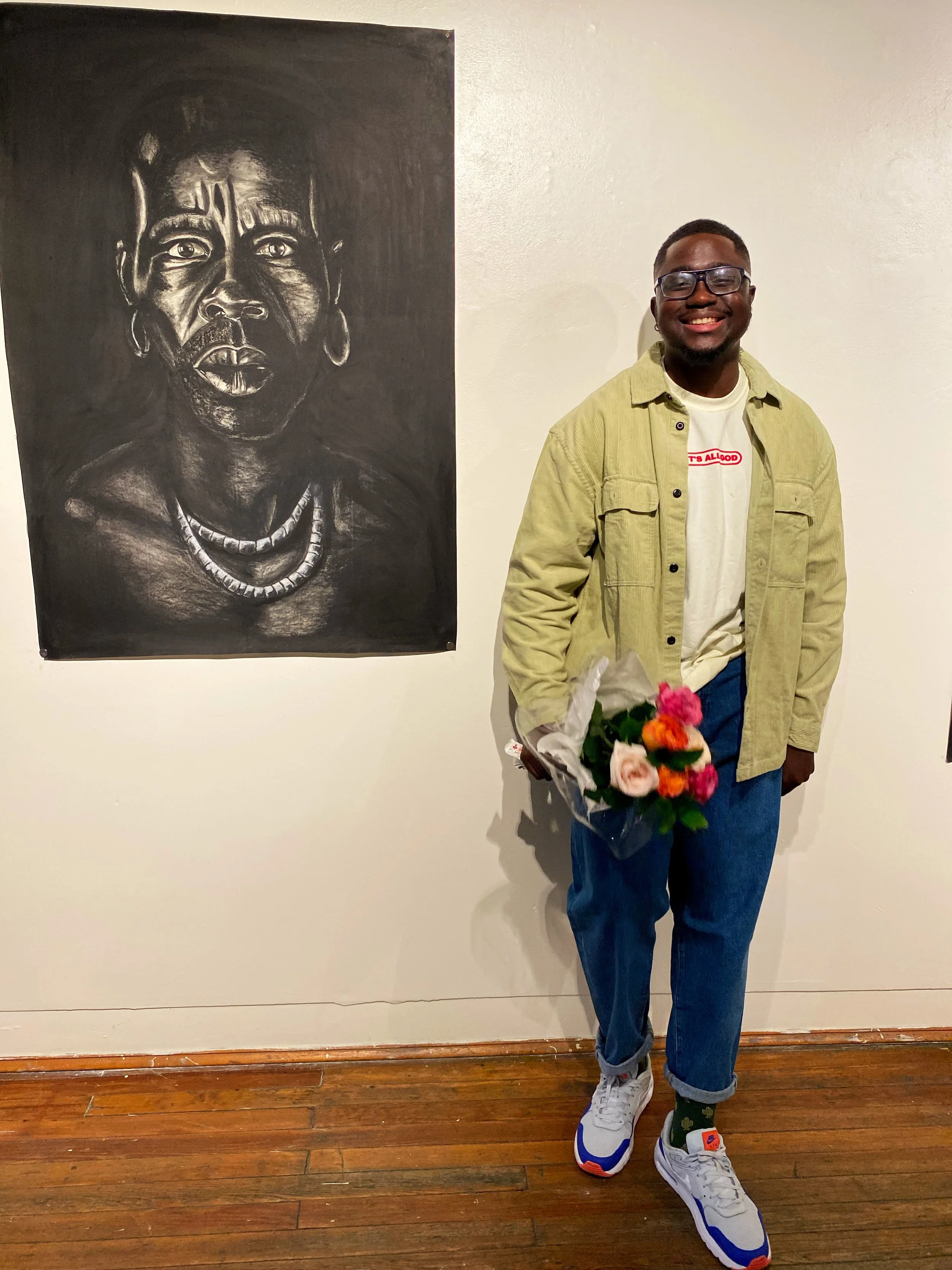 ALPHA Massaquoi Jr. is a Baltimore based artist that works primarily with large drawings made with charcoal and pastels. Alpha was born in West Africa, Liberia, as the youngest of four to an upper-middle-class family; his father worked for the United States embassy in Liberia, and his mother was a talior with a small charcoal business. At age fourteen, Alpha and his family moved to the U.S. seeking the "American dream" However, life wasn't easy, the 2008 recession just happened, and racism and colorism were new challenges Alpha and his family had to face. He got his BA from Towson University and his MFA from SMFA at Tufts. His works have been a part of major group shows in the United States, which include Novo Legado & Black Creatives at The Chicago Museum of Science and Industry. Also, He has a few many major solo shows: Black Noise (Baltimore ), Black Noise (Boston) and Led by The Holy Spirit. . Alpha won the Macon art prize, Free Fall Baltimore grant and Awesome Baltimore grant in 2021, and in 2022 he won he went on to win the Montague Travel grant and The Masc. Independent Artist Award. He was a finalist for the AXA art prize in 2024. He founded Hot Sauce Artist Collective, supporting artists and bridging the gap between the everyday person and the arts.